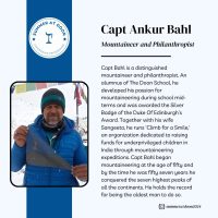 Captain Ankur Bahl is a distinguished mountaineer and philanthropist. An alumnus of The Doon School, he developed his passion for mountaineering during school mid-terms and was awarded the Silver Badge of the Duke Of Edinburgh’s Award. Together with his wife Sangeeta, he runs ‘Climb for a Smile,’ an organization dedicated to raising funds for underprivileged children in India through mountaineering expeditions. Capt Bahl began mountaineering at the age of fifty and by the time he was fifty seven years he conquered the seven highest peaks of all the continents. He holds the record for being the oldest man to do so.
